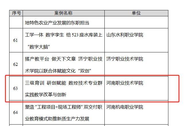近日,教育部职业教育与成人教育司发布了《关于公布2024年产教融合、校企合作典型案例名单的通知》,河南职院报送的《三级育训,研创赋能,数控技术专业群实践教学改革与创新》案例成功入选。
