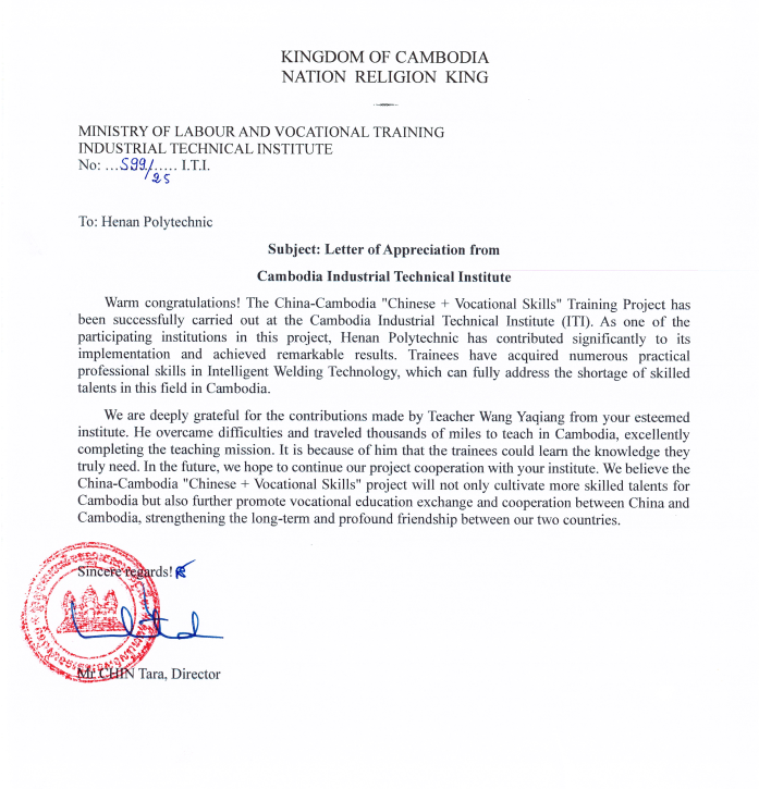 柬埔寨工业技术学院感谢函